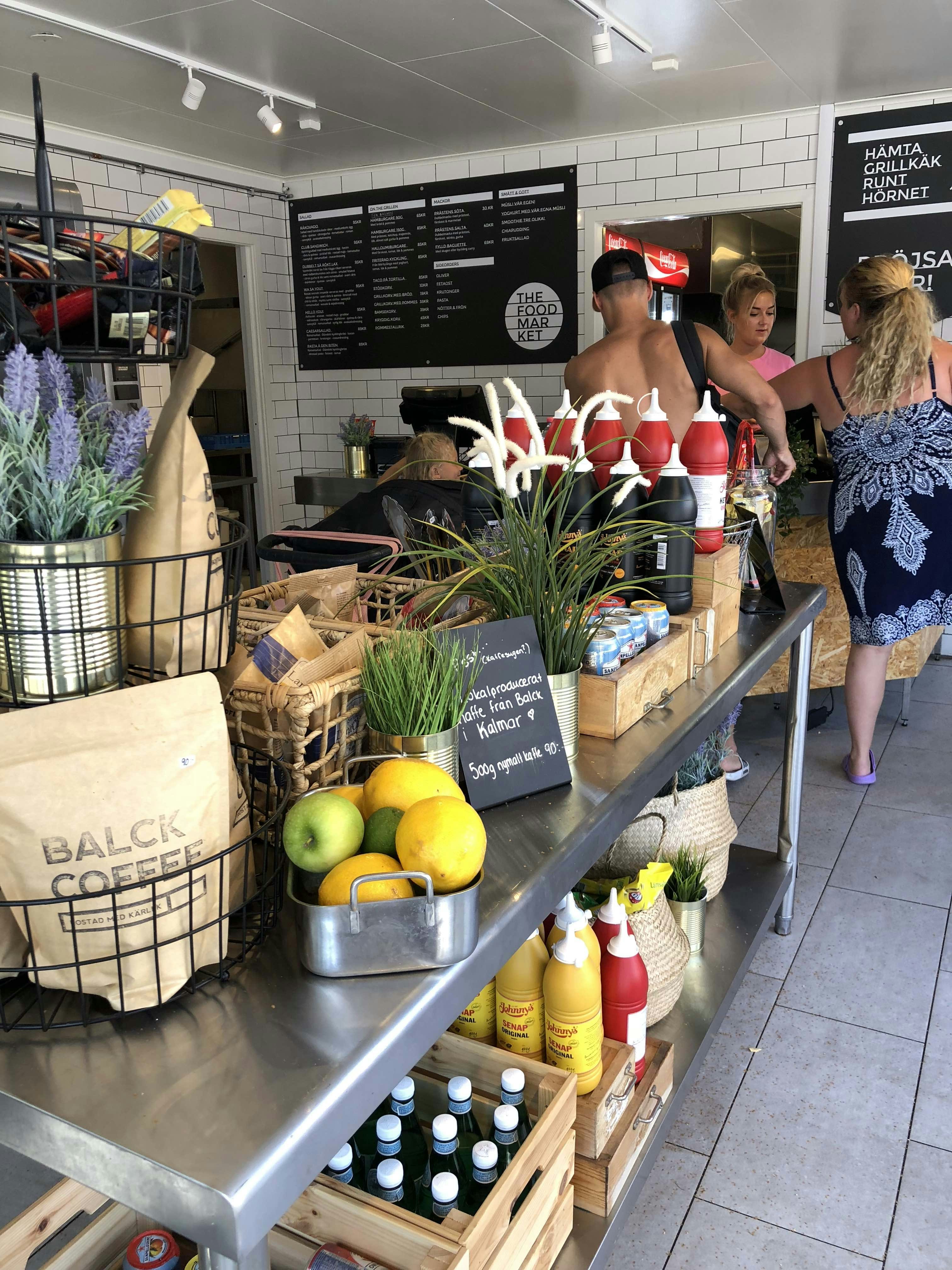 På Foodmarket erbjuder vi såväl dagsbesökare som campinggäster ett fräscht och trendigt gatukökskoncept med sallader, mackor, smoothies, fruktsallader men också riktigt goda burgare på nymalt högrev och prästost. Eller varför inte vår grymma fried chicken på Öländsk majskyckling?