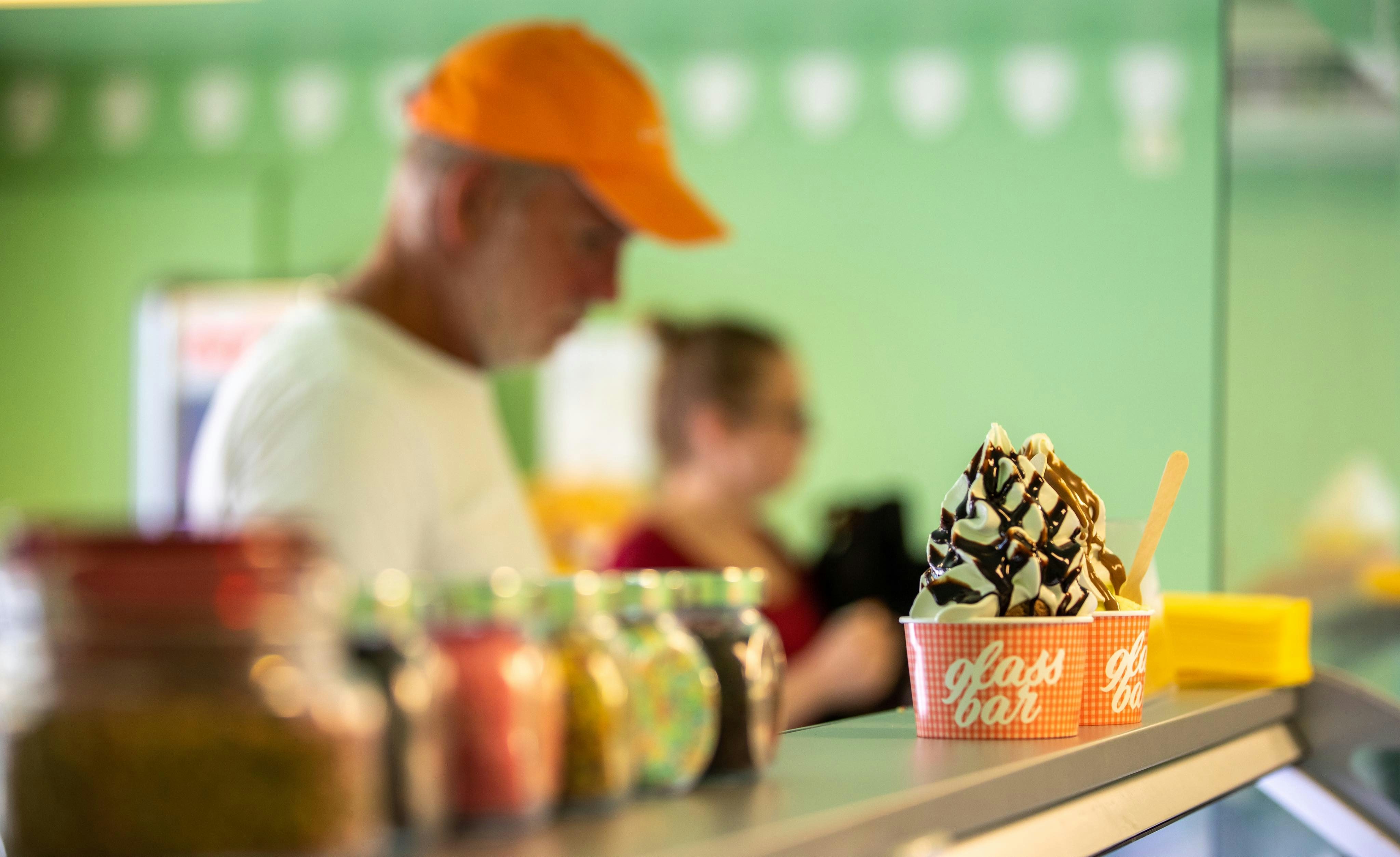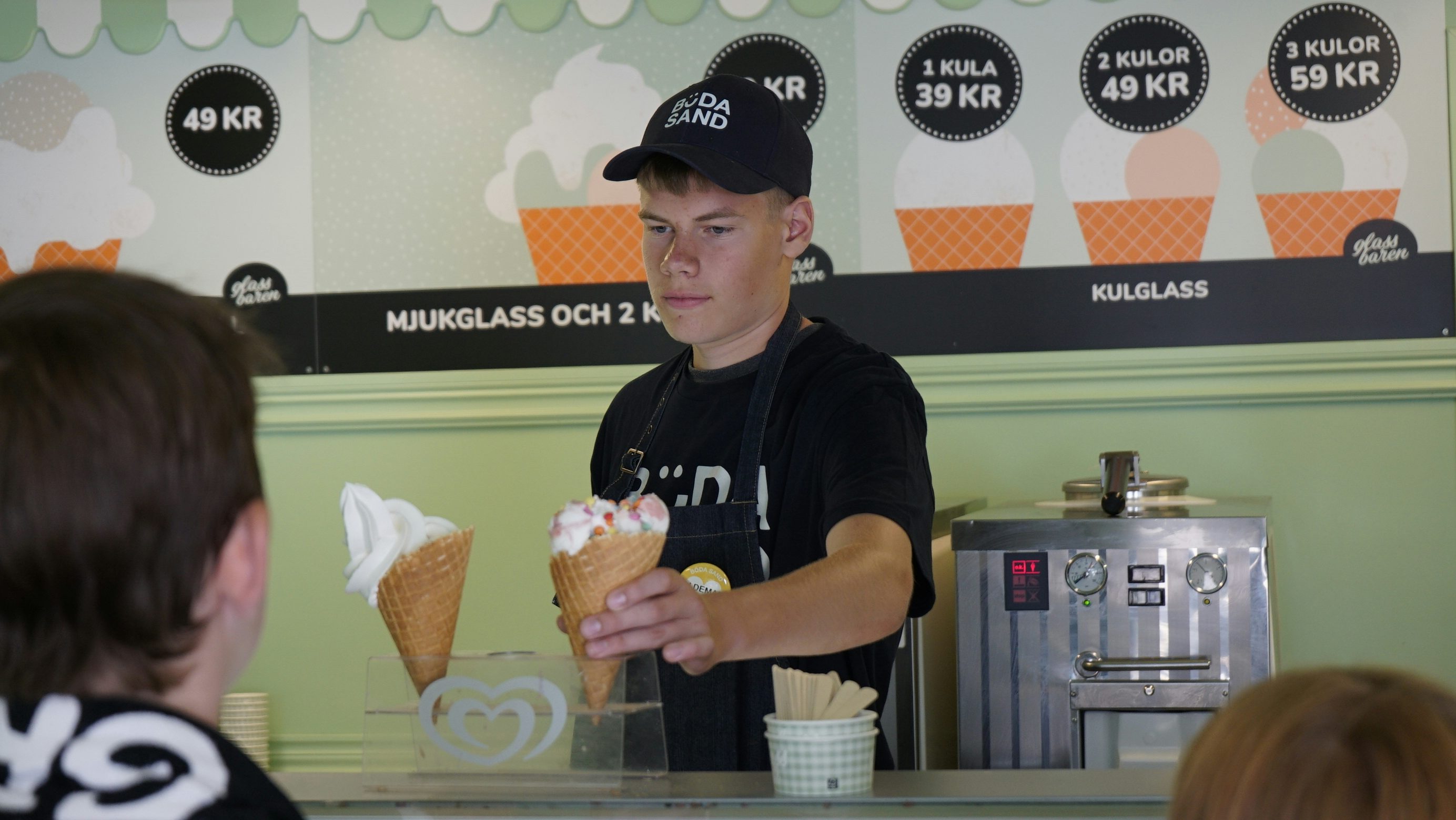 Kom in till Böda Sands glassbar och ge utlopp för kreativiteten inom dig! Mängder med kulglass-smaker kan kombineras hej vilt med mjukglass och andra godsaker. Strössel och topping är gratis så bomba på så mycket ni orkar!