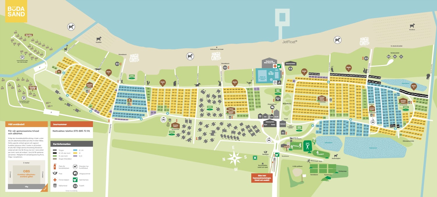 Vi är stolta över en hög standard på vår camping - här finns alltid närliggande servicehus och de flesta förnödenheter så att du verkligen kan slappna av och få bästa möjliga upplevelse för hela familjen. Böda Sand är en av Ölands största arbetsplatser, här finns personal som kan hjälpa er med nästan allt mellan himmel och jord - från barnledare till tandläkare. Under högsäsong patrullerar vakter området på natten, området är en trygg plats att vistas på även när vi är helt fullbokade.