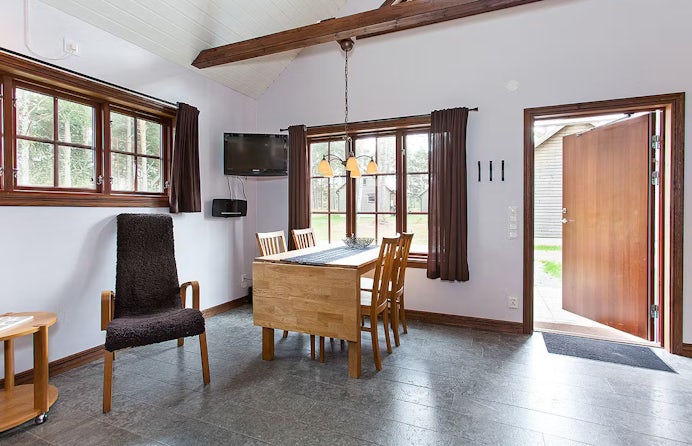 Från den egna möblerade uteplatsen är det bara några hundra meter till havet. Bilen parkerar du gratis på närliggande parkeringsplats. Det går bra att köra in och lasta av vid stugan.