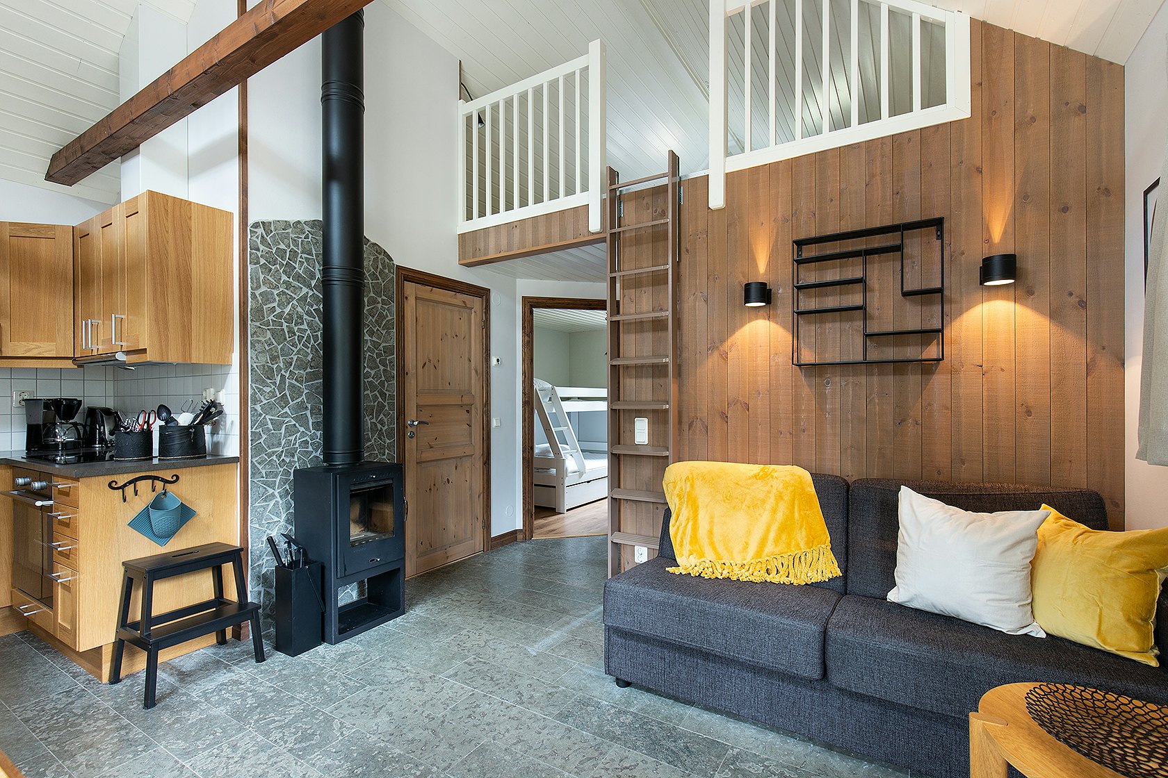Husen är modernt inredda med marbodalkök (ugn, micro, diskmaskin, kaffebryggare, stor kyl och frys), öländsk kalksten i golvet med golvvärme. Vardagsrummet har en bäddsoffa, ekmöbler och fårskinnsfåtölj. Ett av sovrummen har en dubbelsäng och en generös garderob och det andra sovrummet har en våningssäng där undersängen är 1,40 bred. I lofthusen finns 2 resårsängar. En braskamin värmer skönt på för- och eftersäsongen eller en regnig sommardag. I stugorna finns gratis tillgång till wifi. Tv-apparaterna är anpassade för eget boxerkort. Standbyns hus ägs av privata ägare men förmedlas av Böda Sand.