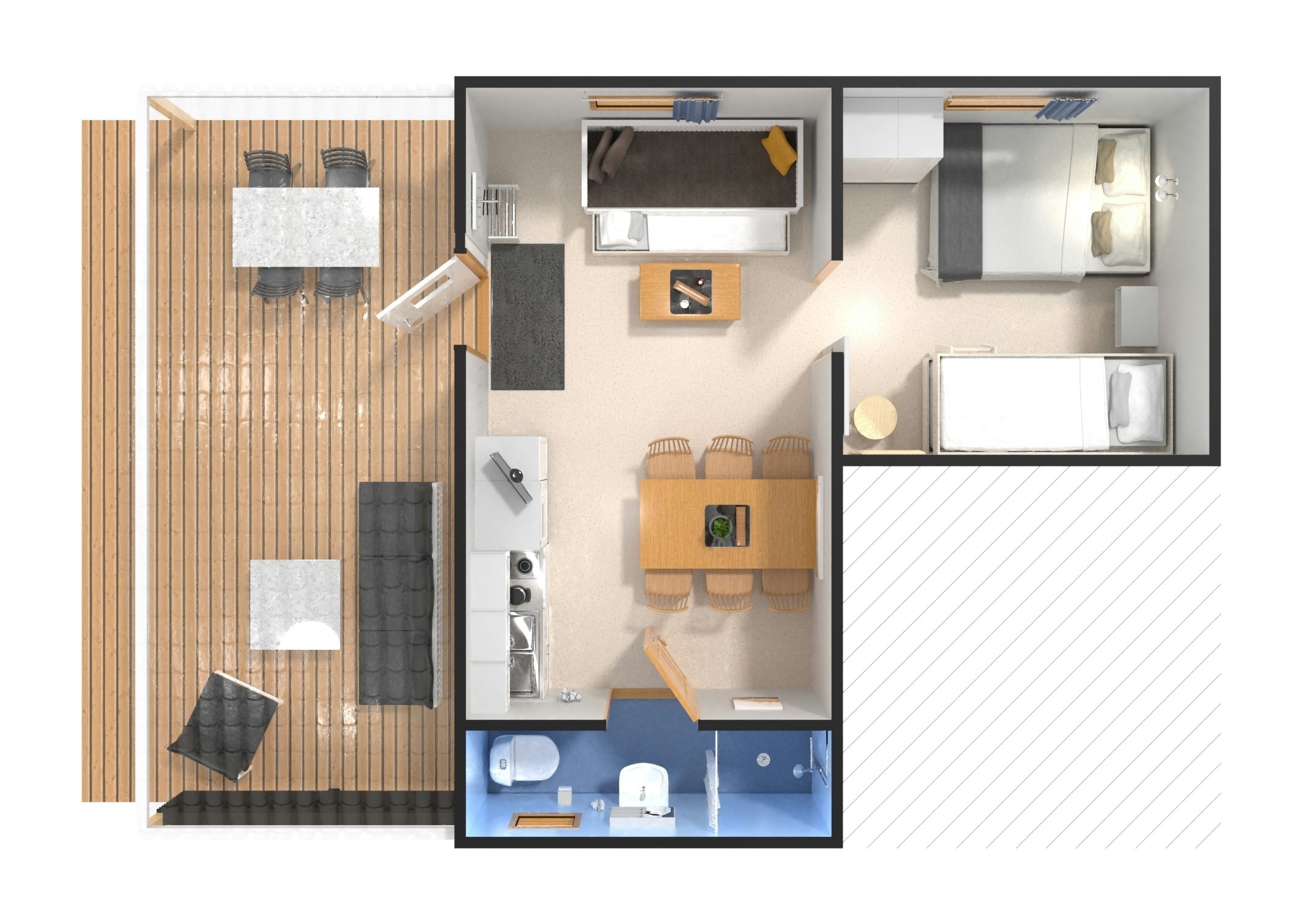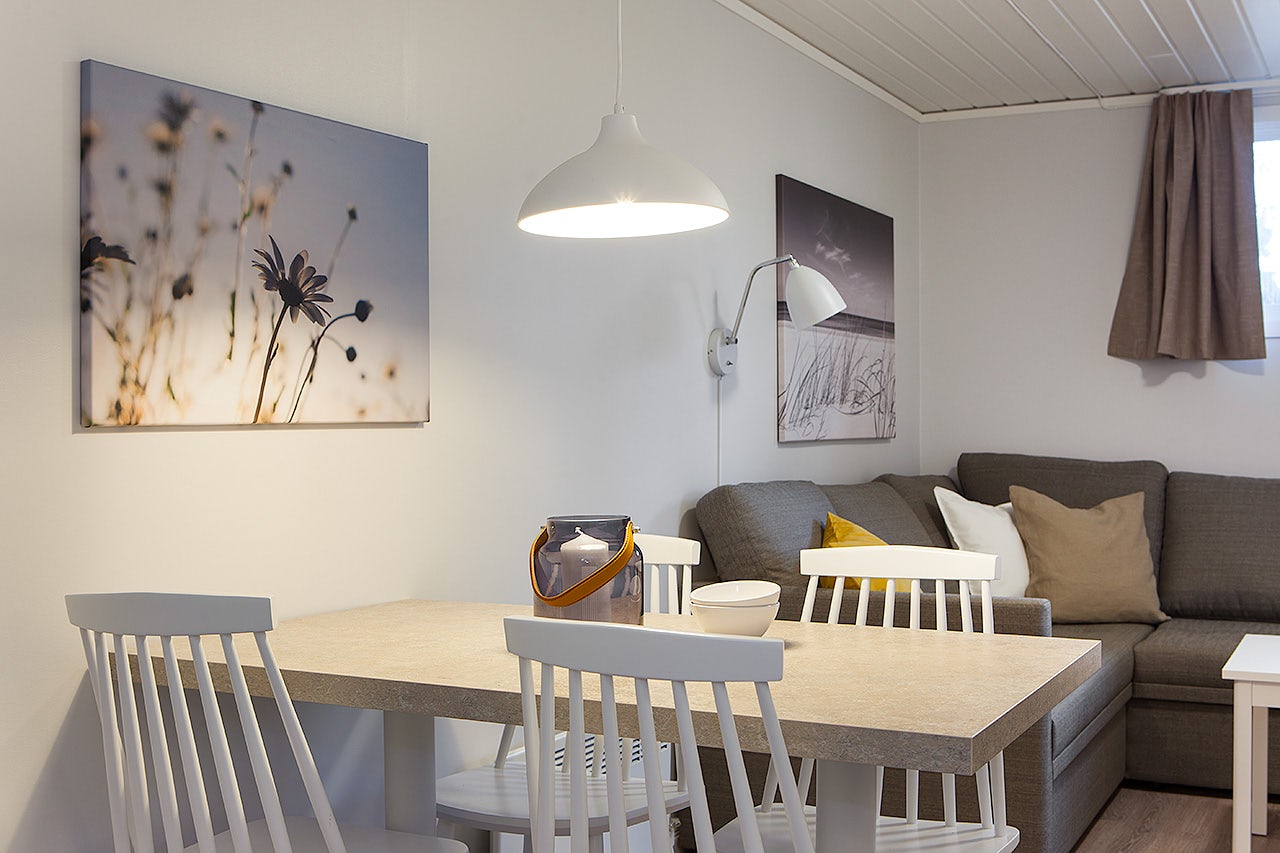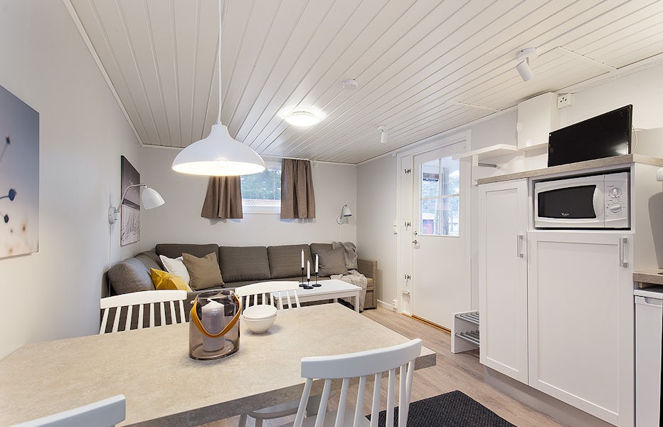 Stugtyp 14 erbjuder ett rymligt och funktionellt boende med dubbelsäng, våningssäng och en bäddbar soffa, vilket gör det enkelt att anpassa boendet för familjen eller vännerna. Stugan är utrustad med dusch, WC och TV för extra komfort, samt ett pentry med köksutrustning, kylskåp med frysfack och kaffebryggare för de bekvämligheter ni behöver under er vistelse. Alla stugor har en möblerad altan där ni kan njuta av härliga dagar och kvällar.