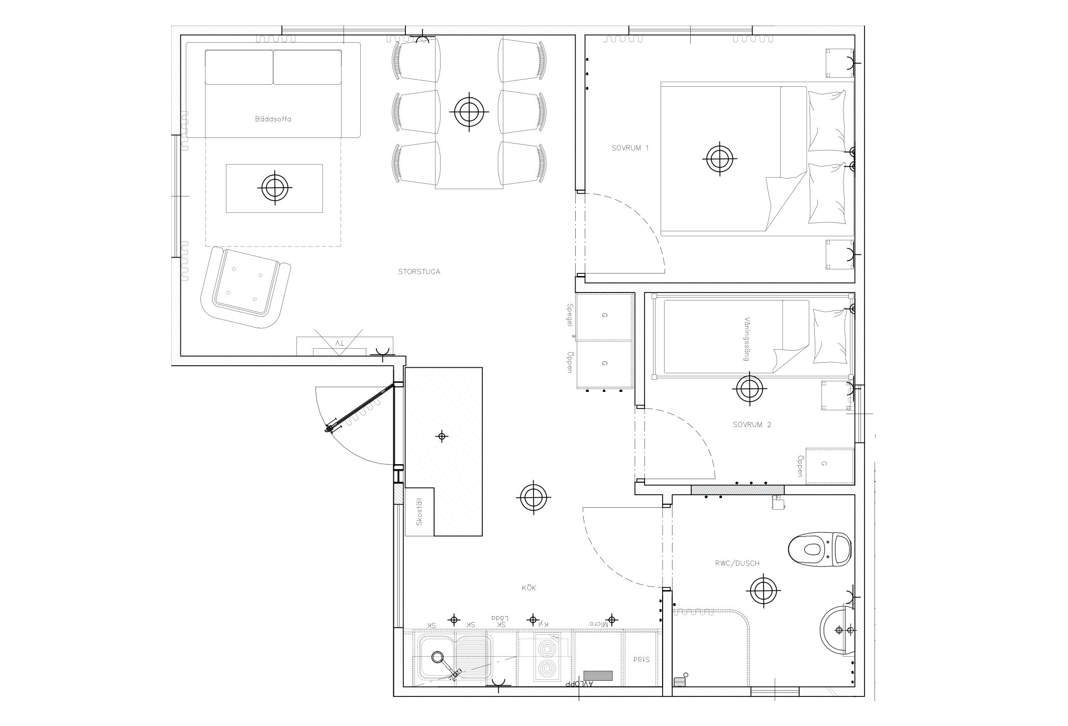 - Dubbelsäng, våningssäng och bäddbar soffa