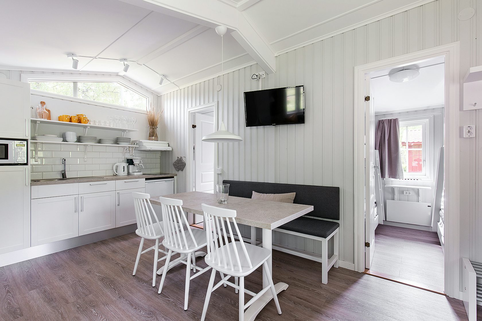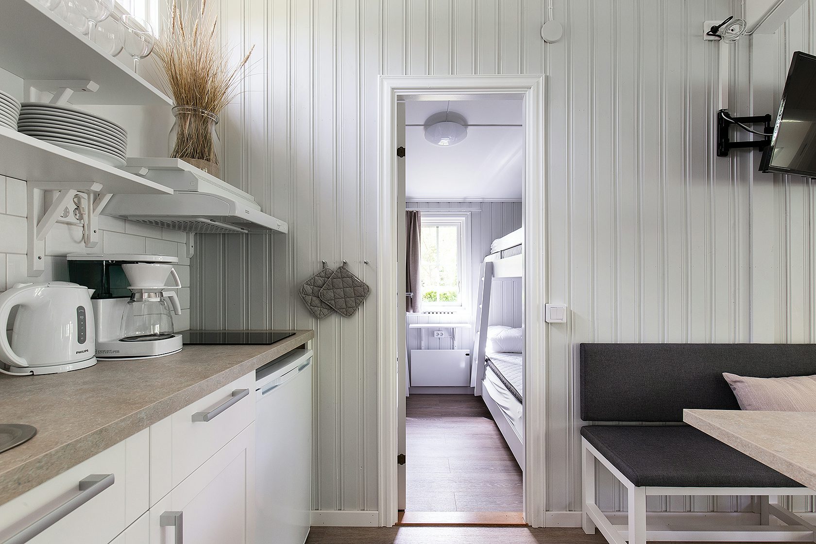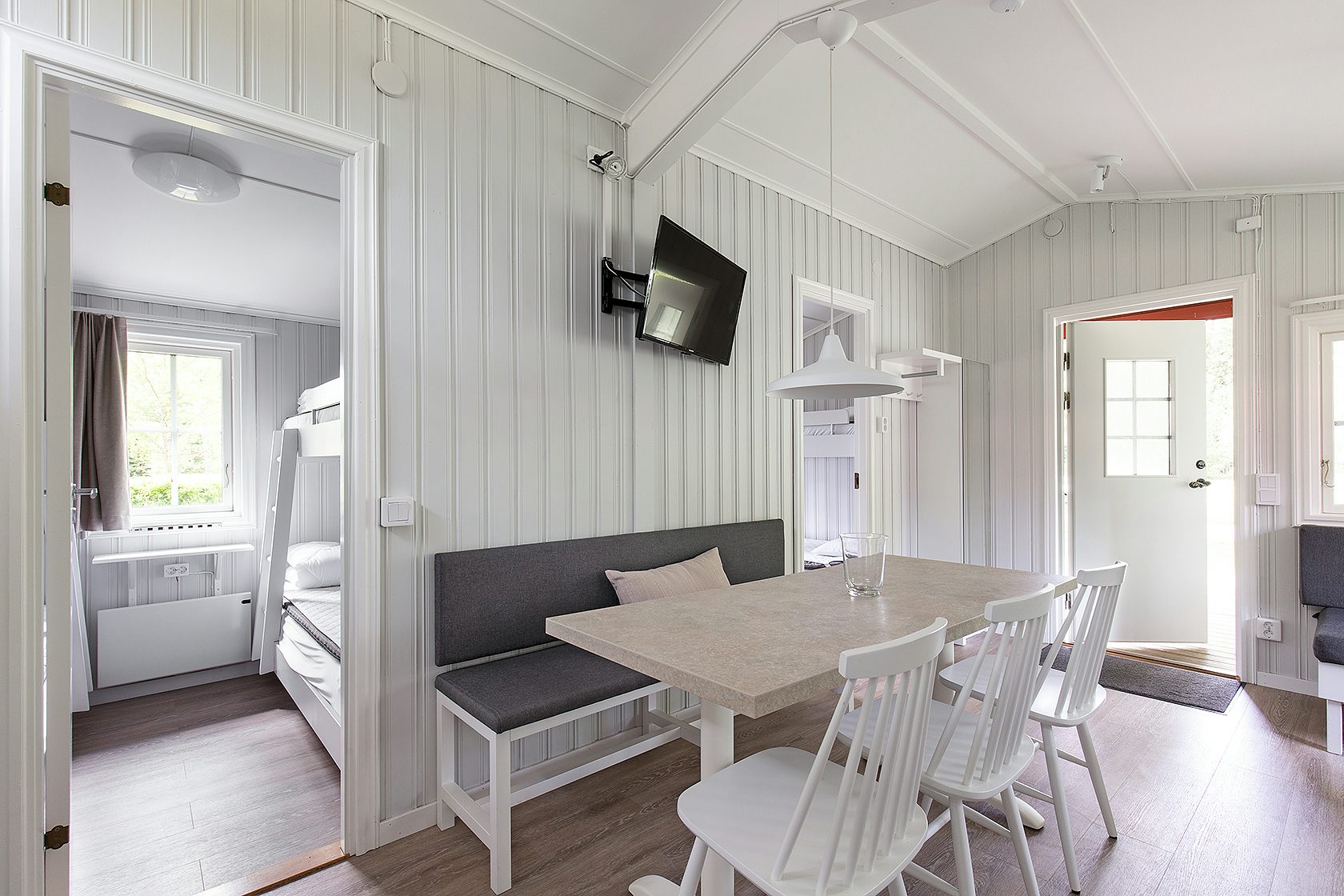 Stugtyp 16 är ett fristående hus som erbjuder gott om plats för den stora familjen eller en grupp vänner. Här hittar ni fyra våningssängar, fördelade på två separata rum, vilket ger bra sovutrymme för alla. Stugan är utrustad med dusch, WC och TV, samt ett pentry med mikro, kaffebryggare, kylskåp med frysfack och allt ni behöver för att laga era egna måltider. Kuddar och täcken ingår för maximal komfort. Alla stugor har en möblerad altan där ni kan njuta av soliga dagar eller varma kvällar.