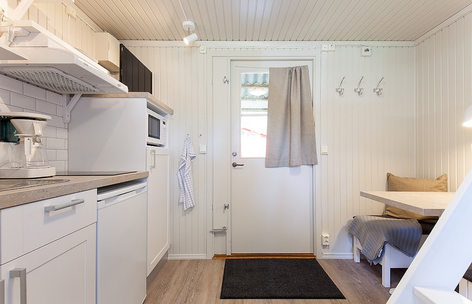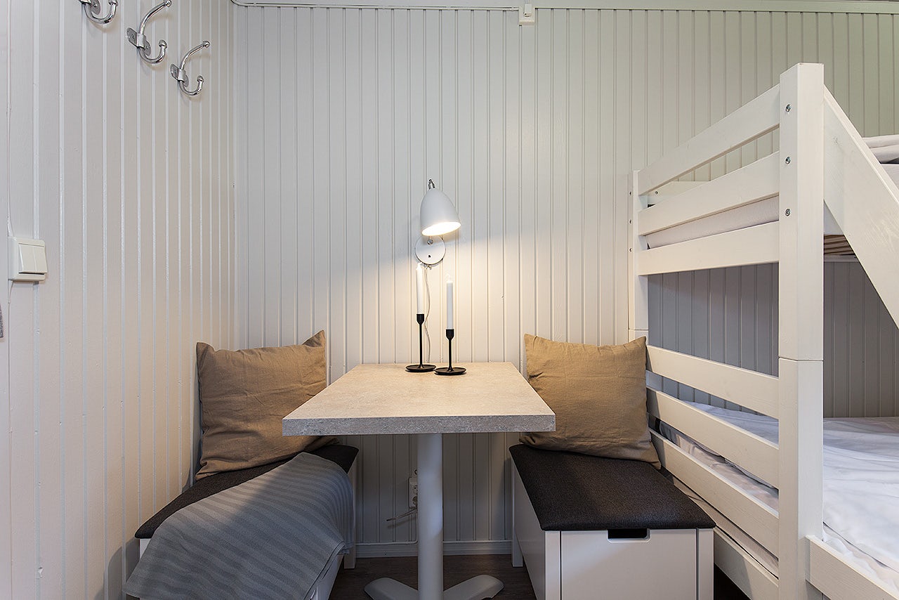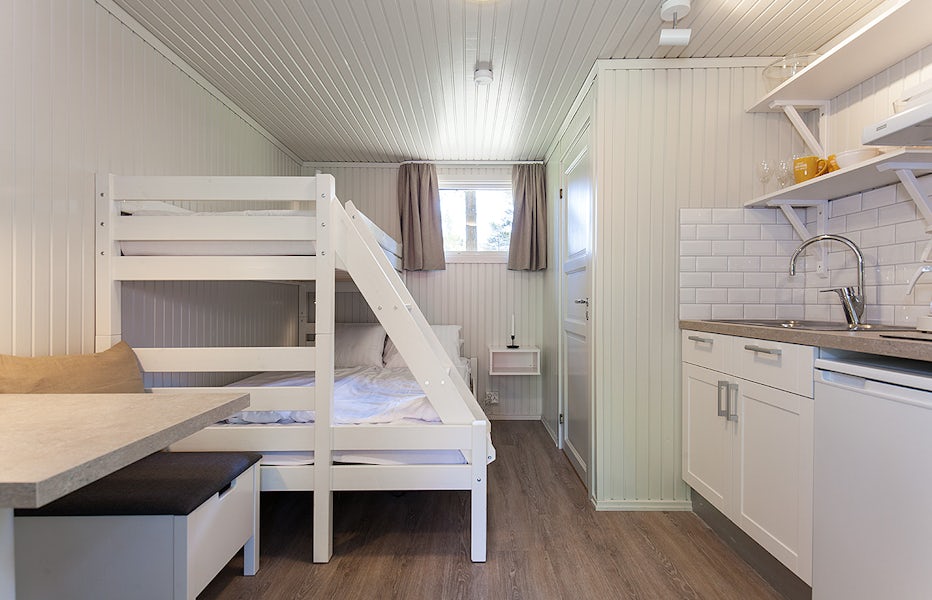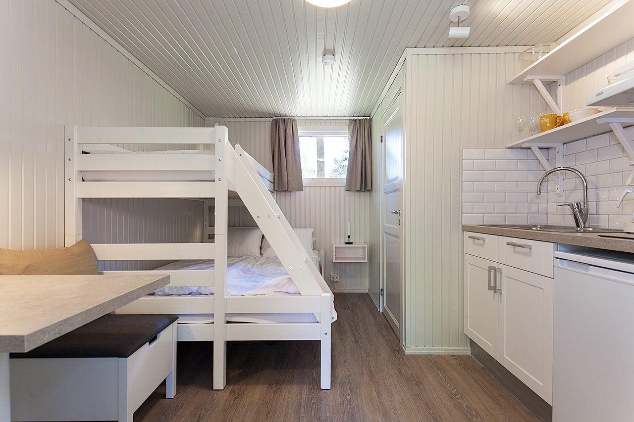 Stuga Typ 3 är ett bekvämt och prisvärt boende i parhusmiljö med en möblerad altan. Här finns en våningssäng med bredare underslaf, vilket gör att du kan bo upp till tre personer. Det finns pentry, WC, TV samt köksutrustning med kylskåp, frysfack, kaffebryggare och vattenkokare. Stugan ligger nära ett servicehus med kök, spis, ugn, diskmaskin och dusch.