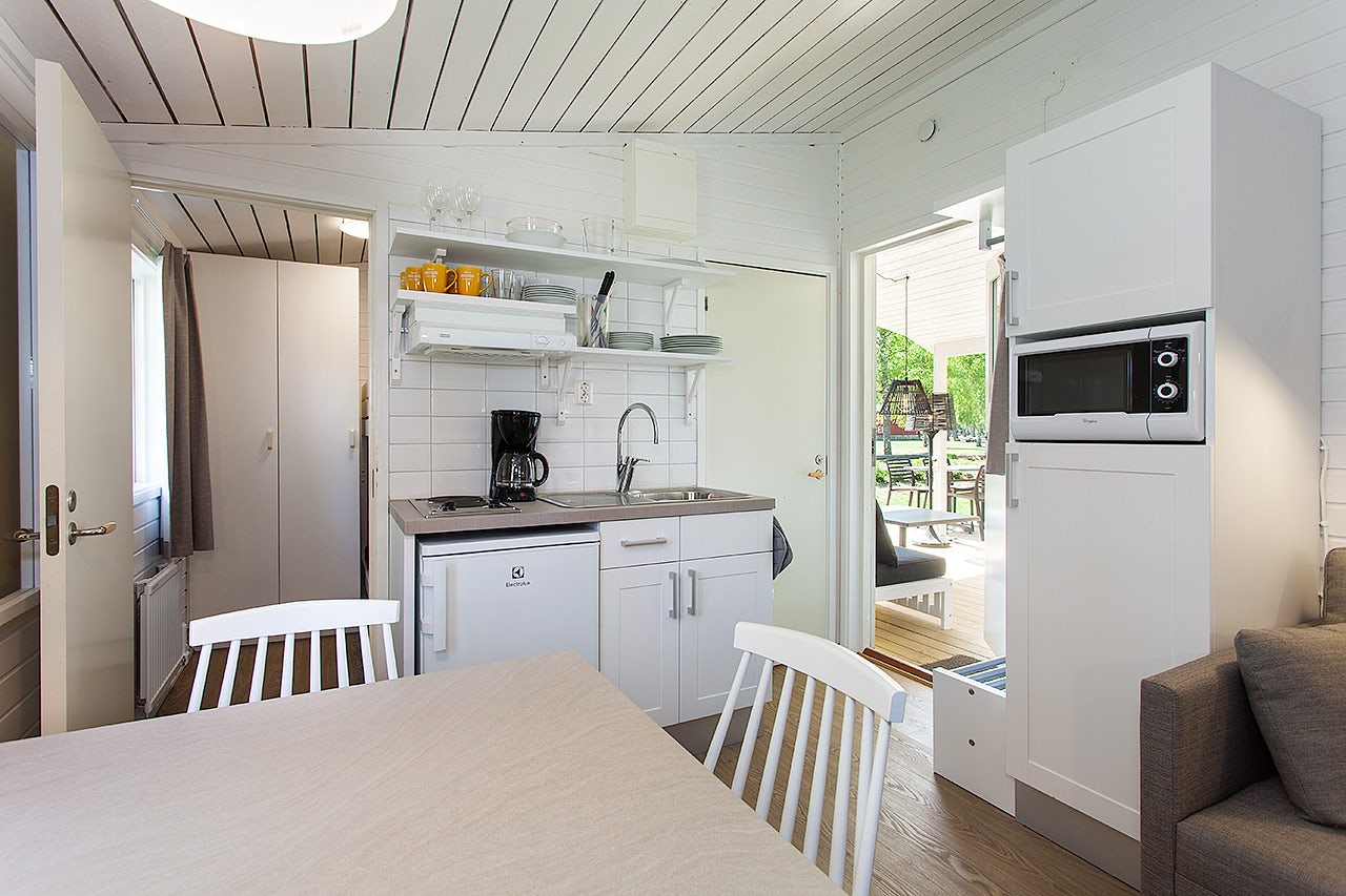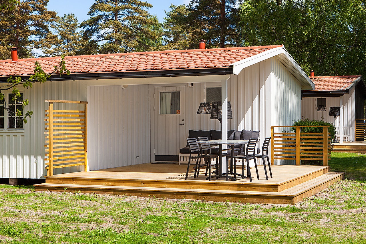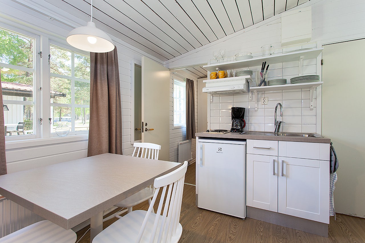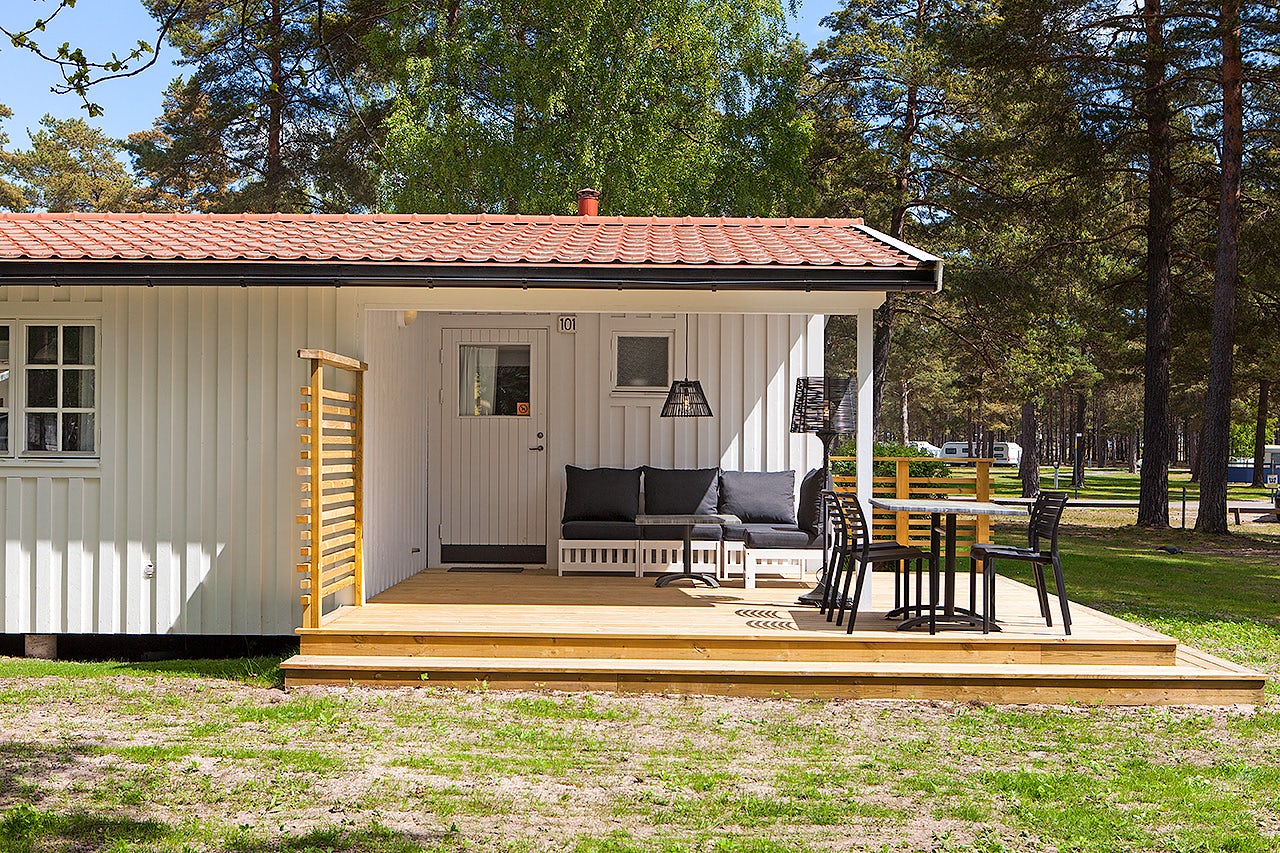 Stugtyp 7:1 erbjuder ett trivsamt boende med våningssäng och ett allrum med bäddbar soffa, perfekt för upp till fyra personer. Här finns ett pentry med köksutrustning, kylskåp med frysfack och kaffebryggare, samt dusch, WC och TV. Alla stugor har en möblerad altan där ni kan njuta av sommarkvällarna.