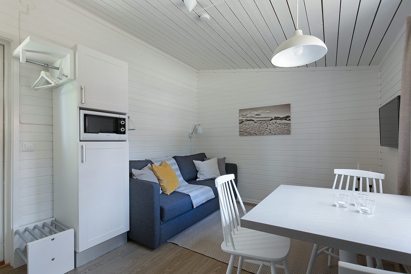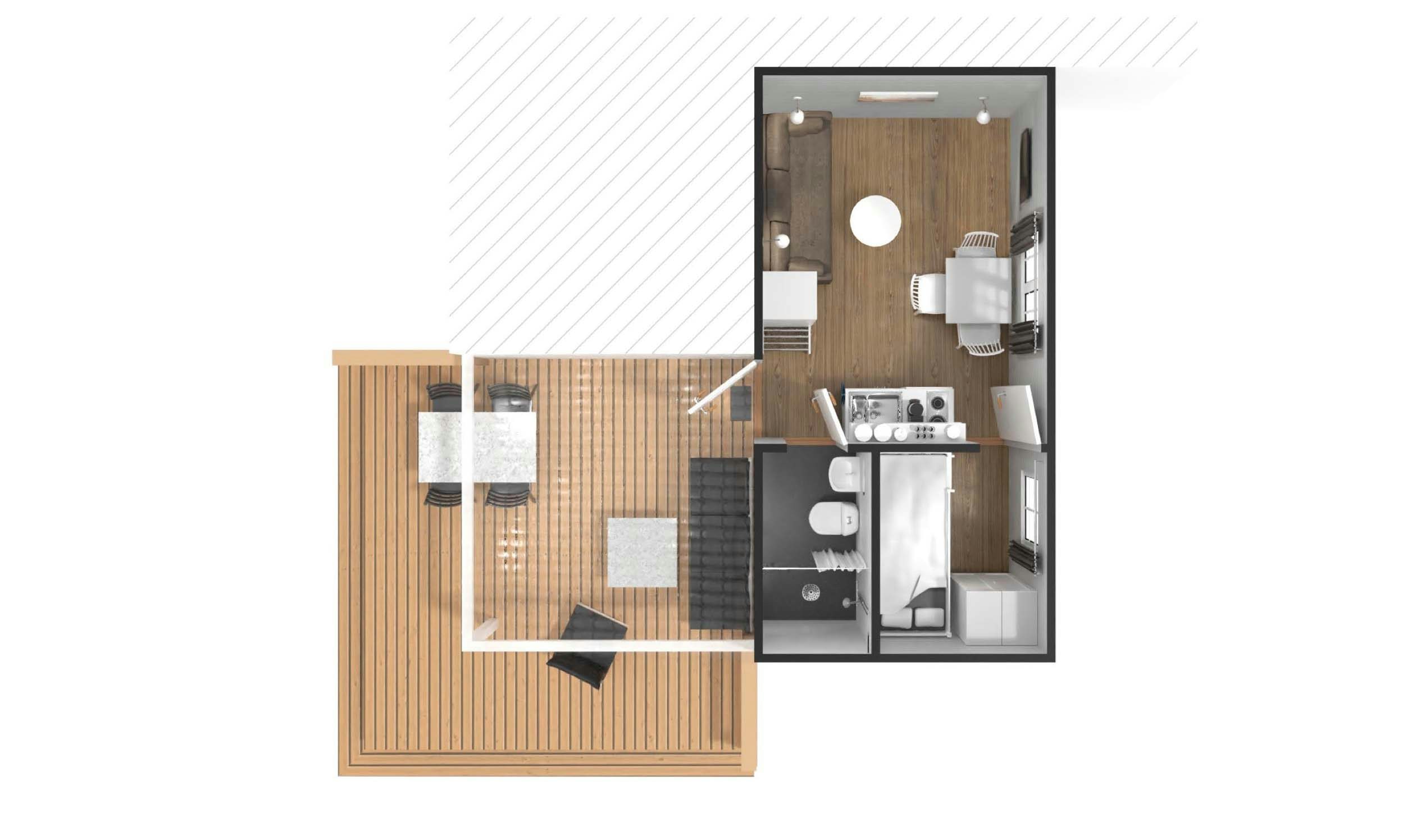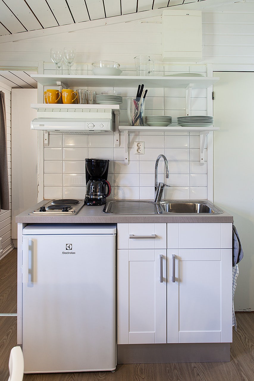Stugtyp 7:1 erbjuder ett trivsamt boende med våningssäng och ett allrum med bäddbar soffa, perfekt för upp till fyra personer. Här finns ett pentry med köksutrustning, kylskåp med frysfack och kaffebryggare, samt dusch, WC och TV. Alla stugor har en möblerad altan där ni kan njuta av sommarkvällarna.