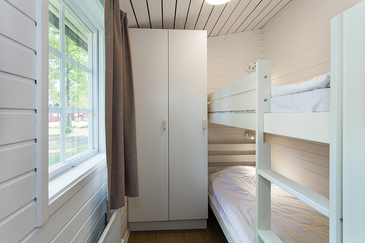 Stugtyp 7:1 erbjuder ett trivsamt boende med våningssäng och ett allrum med bäddbar soffa, perfekt för upp till fyra personer. Här finns ett pentry med köksutrustning, kylskåp med frysfack och kaffebryggare, samt dusch, WC och TV. Alla stugor har en möblerad altan där ni kan njuta av sommarkvällarna.