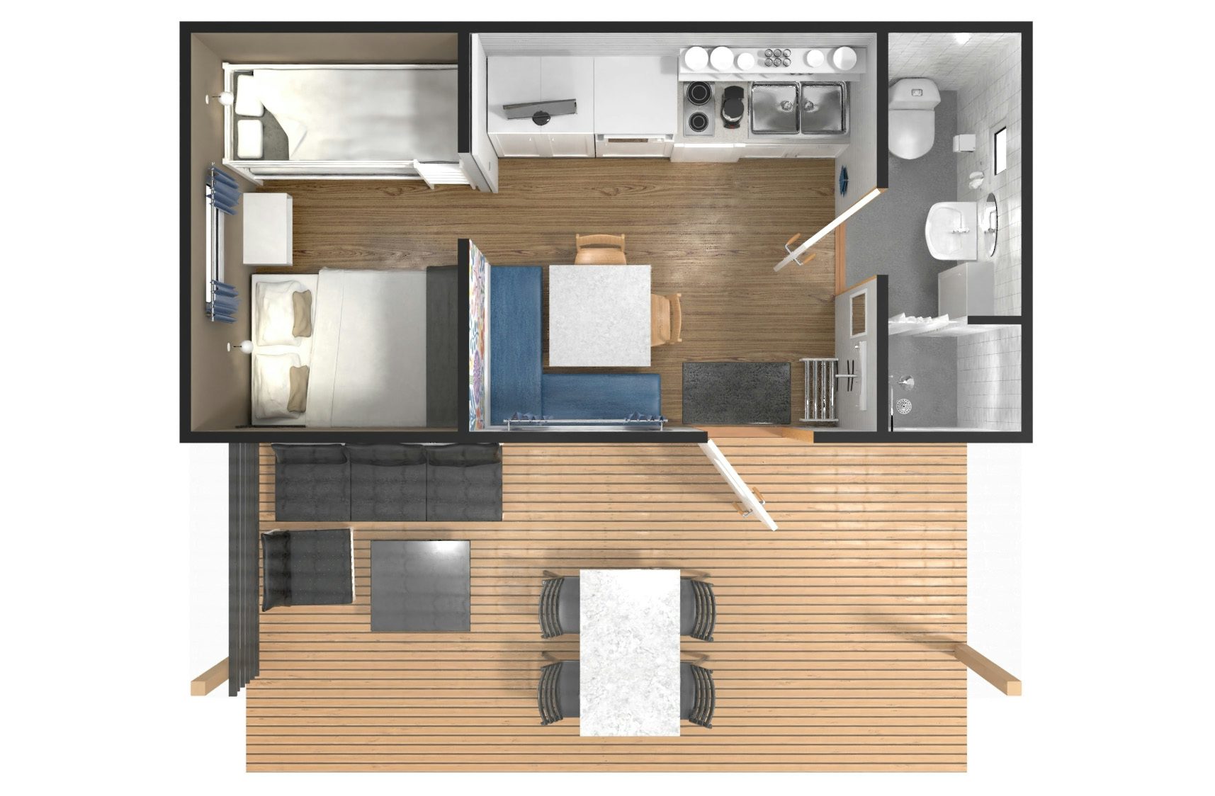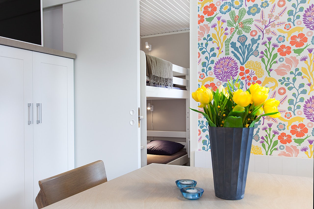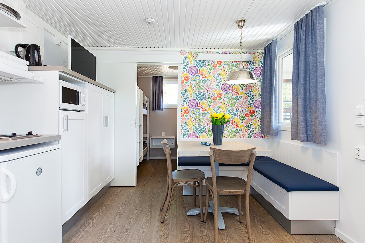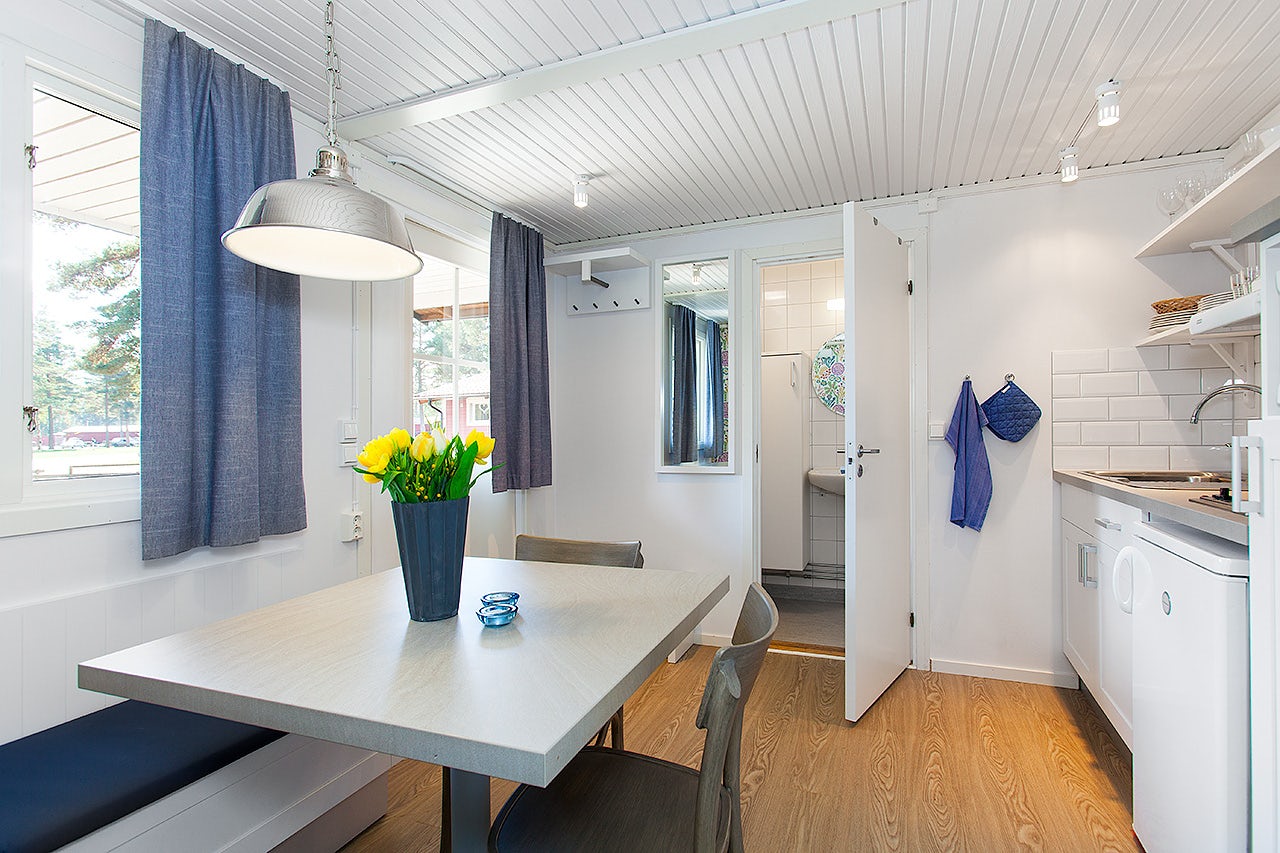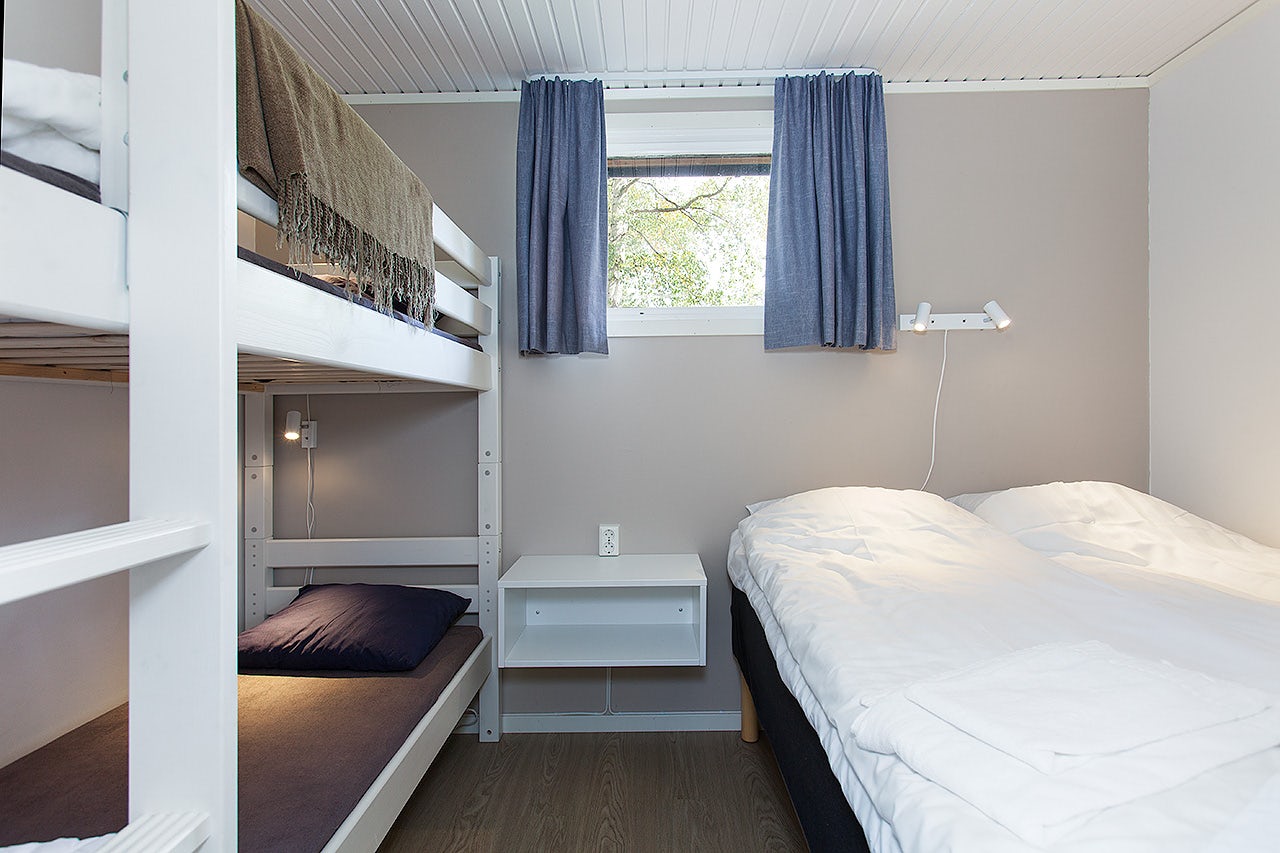Stugtyp 7:2 är ett utmärkt val för familjen som vill ha det både mysigt och bekvämt. Med ett separat sovrum som rymmer en dubbelsäng och en våningssäng finns här gott om plats för en avkopplande vistelse. Stugan har ett praktiskt pentry med köksutrustning, kylskåp med frysfack, spis och kaffebryggare. Dusch, WC och TV finns för extra komfort, och alla stugor har en möblerad altan där ni kan njuta av morgonkaffet och sommarkvällarna.