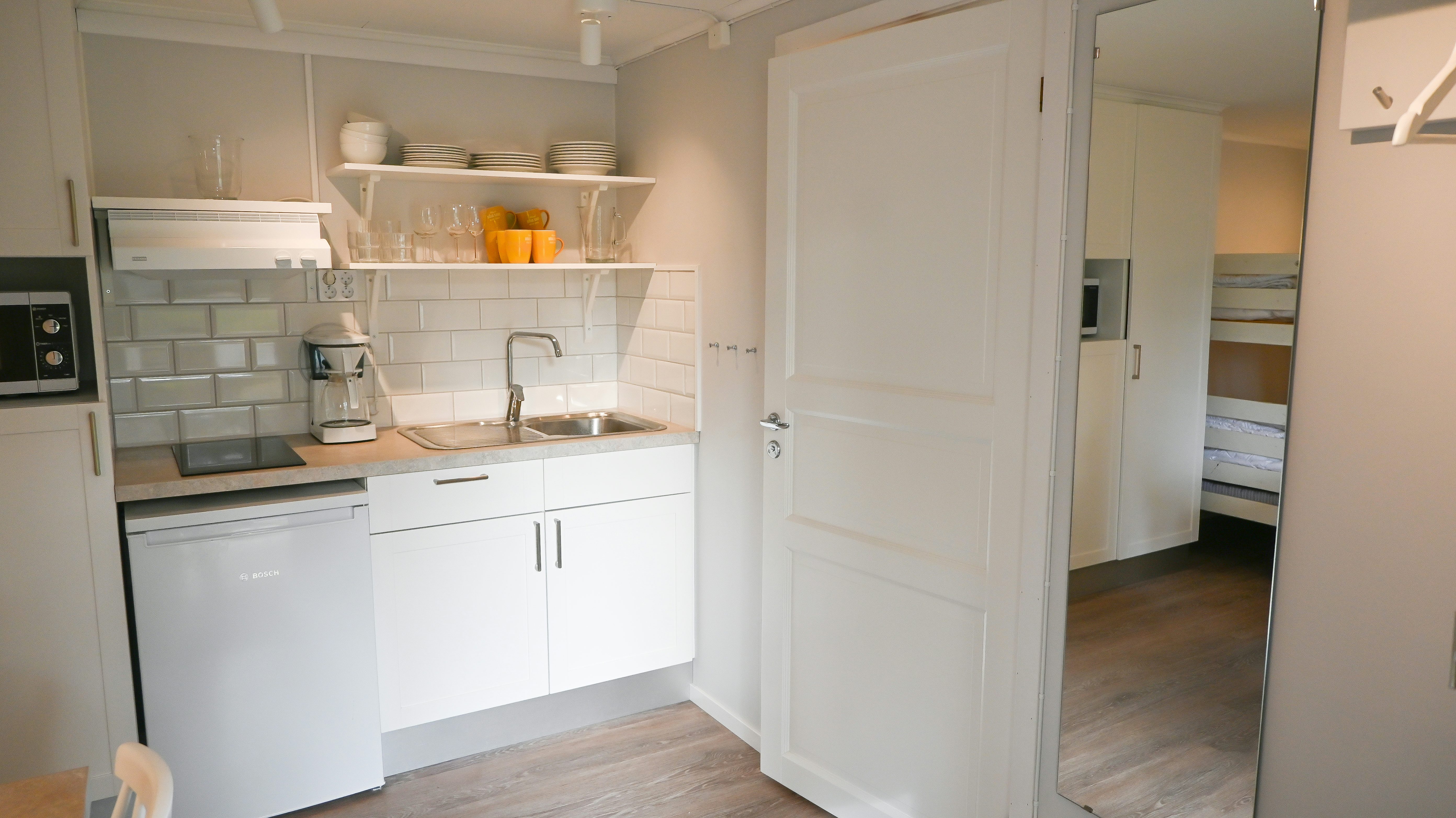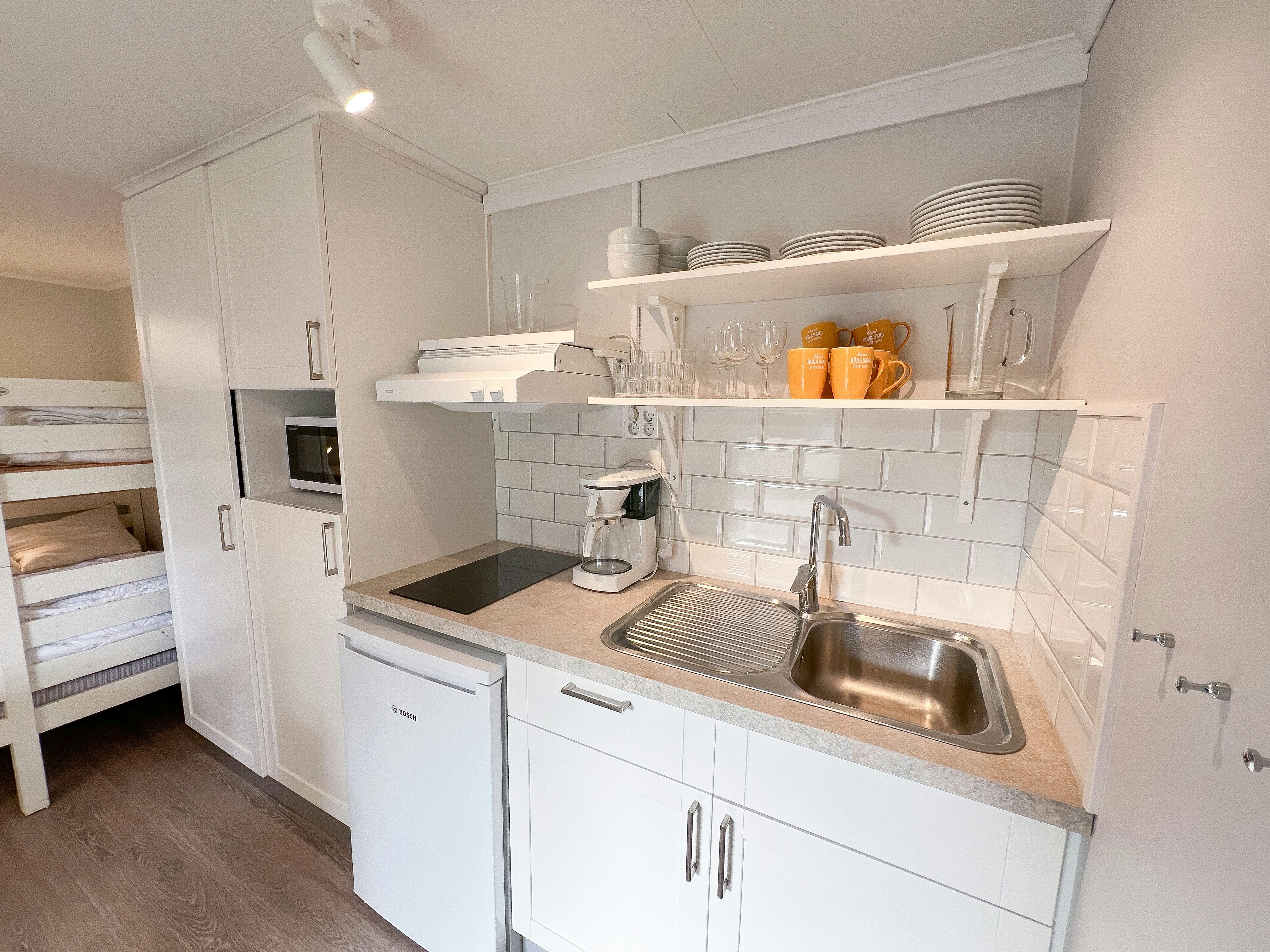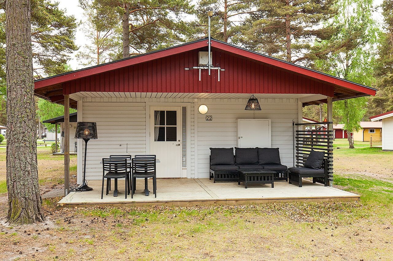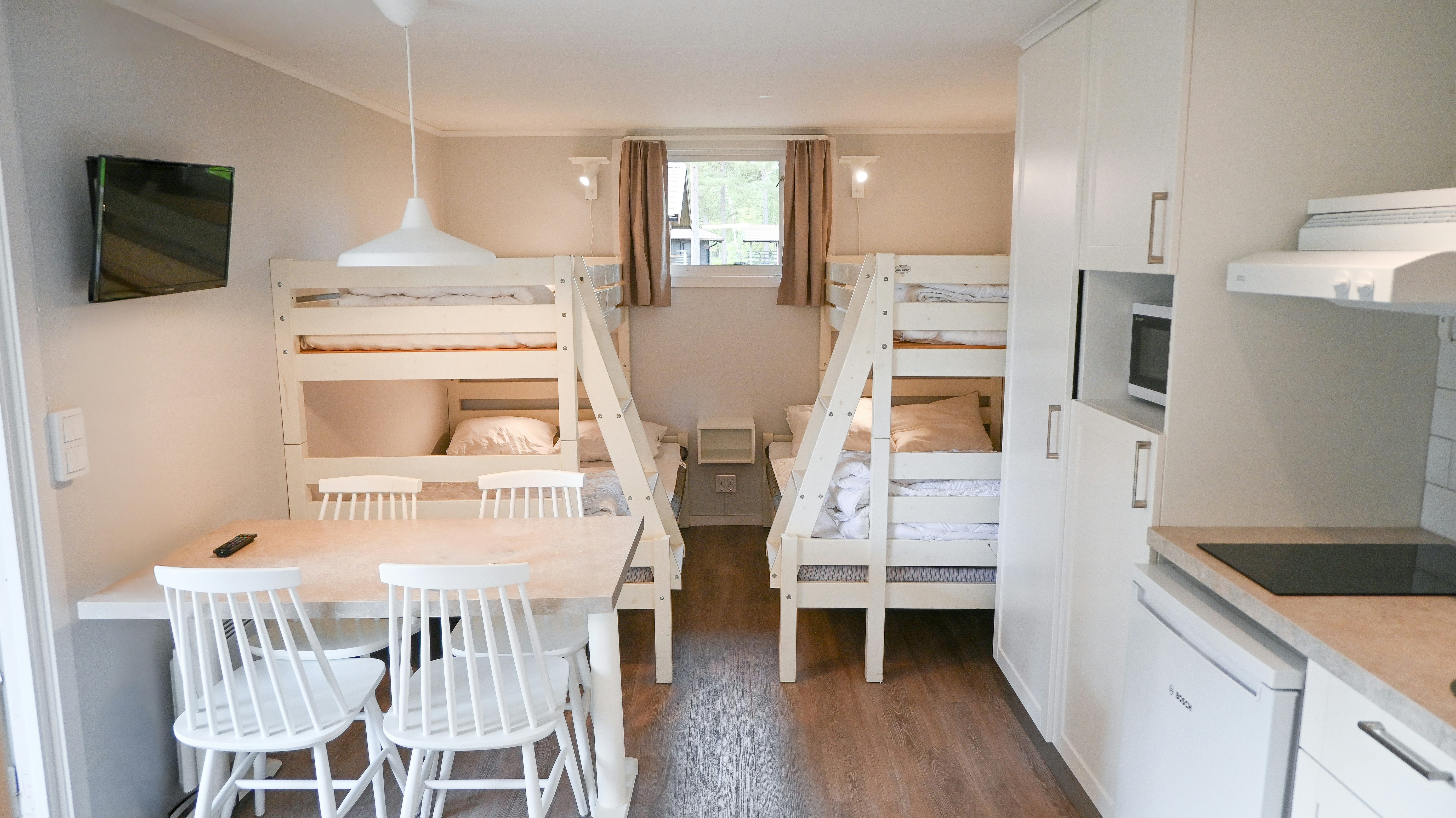 Stugtyp 8 är ett perfekt val för den lilla familjen eller ett par vänner som söker en bekväm och prisvärd semester. Stugan har två våningssängar med bredare underslaf, vilket ger bra sovmöjligheter i ett kombinerat sov- och allrum. Här finns ett pentry med köksutrustning, kylskåp med frysfack och kaffebryggare, samt dusch, WC och TV för extra bekvämlighet. Alla stugor har en möblerad altan där ni kan koppla av efter dagens äventyr.