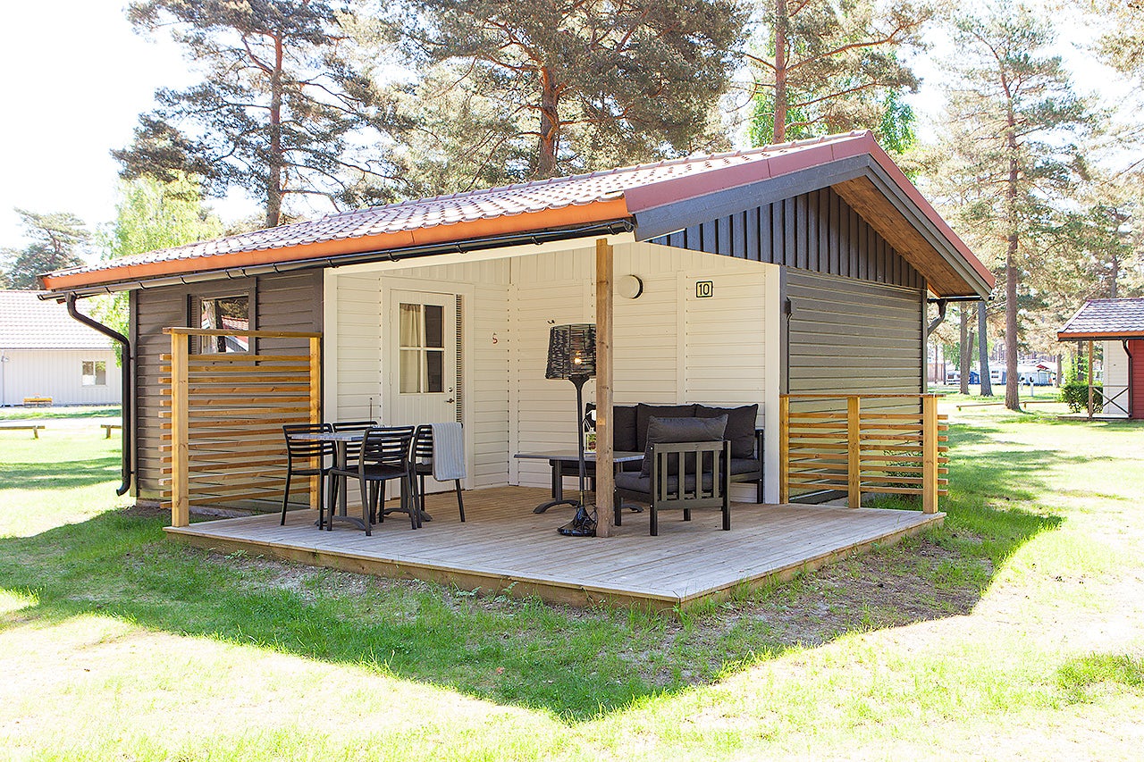 Stugtyp 9 erbjuder ett perfekt boende för familjen eller en grupp vänner som söker både komfort och utrymme. Här finns två separata sovrum – ett med dubbelsäng och ett med våningssäng med bredare underslaf – samt en bäddbar soffa i allrummet, vilket ger gott om sovplatser. Stugan är utrustad med ett pentry med köksutrustning, mikro, kylskåp med frysfack och kaffebryggare. Dusch, WC och TV finns också för en bekväm vistelse. Alla stugor har en möblerad altan, perfekt för att koppla av efter en aktiv dag.